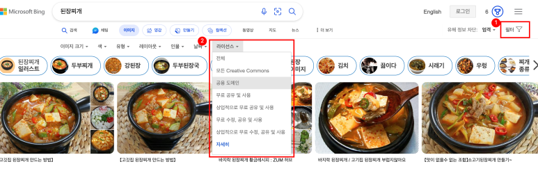 구글과 마찬가지로 필요한 이미지를 검색 후 기본값으로 [전체] 를 보여주기에 필터 > 라이선스 > 공용 도메인 을 선택합니다.