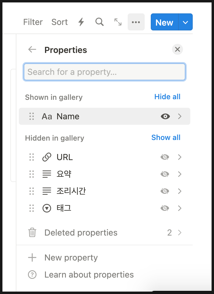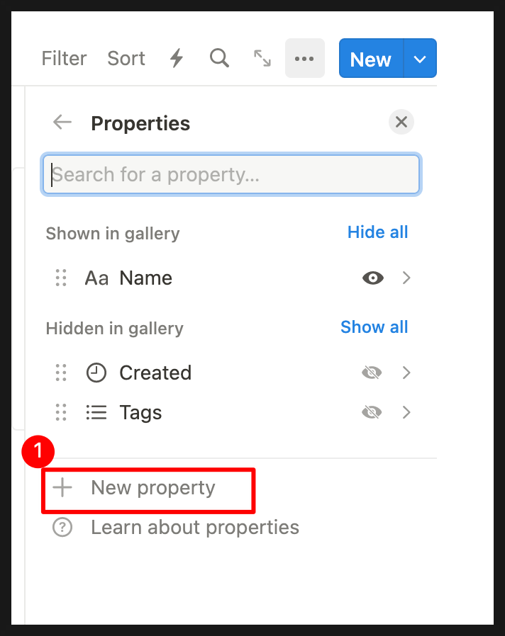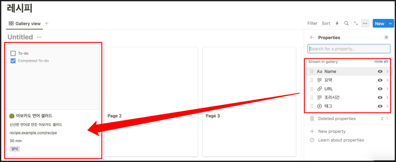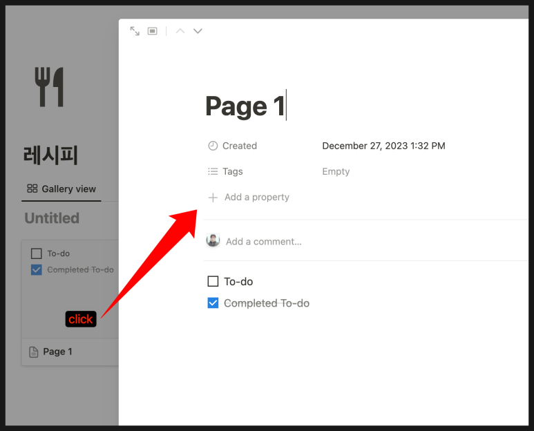 다른 방법은 특정 갤러리 하나를 클릭 > 페이지 진입 > + Add a property 속성을 추가 할 수 있어요.