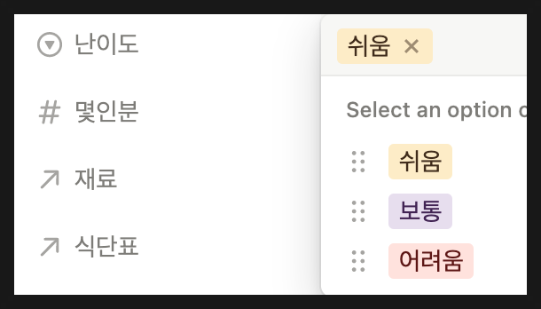 노션이 지원하는 여러가지 속성을 추가를 할 수 있습니다.