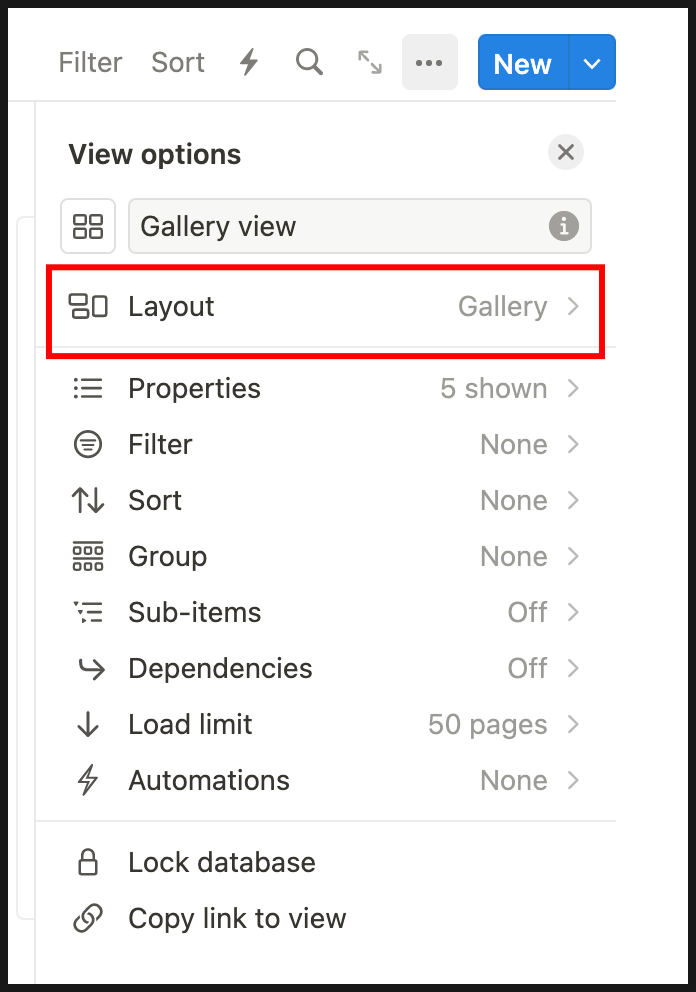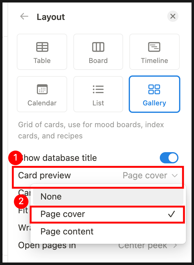Card preview > Page cover 클릭 (기본값은 콘텐츠) 하면 갤러리뷰가 완성됩니다.