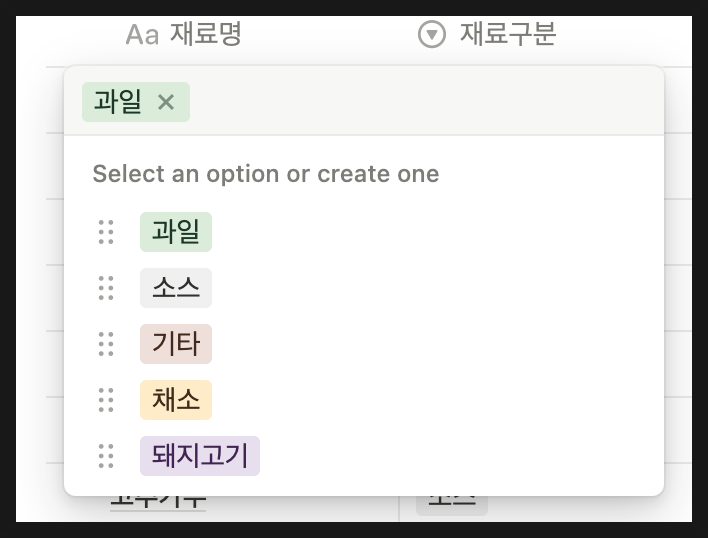 3. 재료구분 (select) 추가