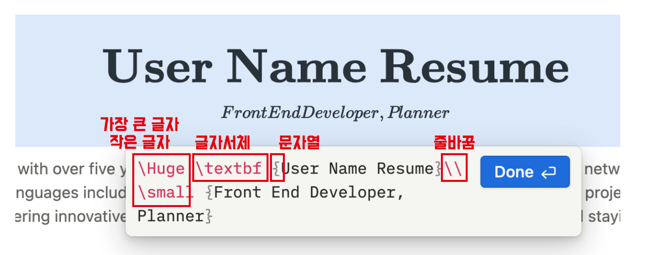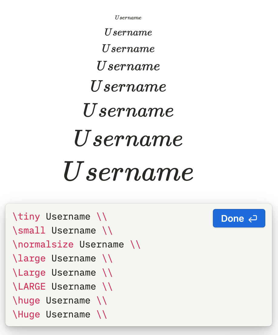 \ 글씨크기 문법 | * 아래로 갈 수록 큰 글씨 * 대소문자를 구분함 tiny small normalsize large Large LARGE huge Huge |