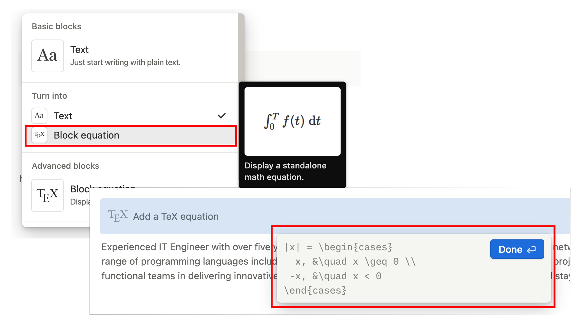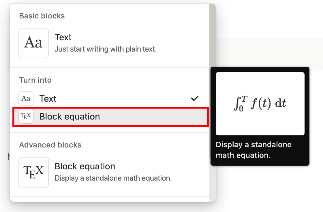 여기 블록에 쓰이는 것은 Tex 문법이라고 하는데요. 전문적인 수학공식을 활용하는 관련자가 아닌 이상 노션에서 쓸일은 없으니 자세한건 넘어가도록 할게요.